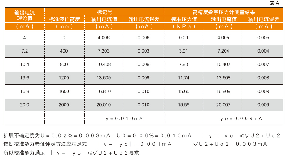 ? ? ? 驗證方法依據(jù)JJF1033-2001《計量標(biāo)準(zhǔn)考核規(guī)范》中規(guī)定的方法用傳遞比較法,用新研制的“液位計檢定裝置”測量一穩(wěn)定被測對象,然后將該被測對象用另一套更高級的計量標(biāo)準(zhǔn)進(jìn)行測量,應(yīng)滿足式∣y-yo∣<√U2+Uo2 的要求。用本所新研制的“液位計檢定裝置”,選擇的被測對象為“壓力式液位計”,依據(jù)JJG971——2002《液位計計量檢定規(guī)程》,用檢定液位的方法對液位計進(jìn)行測試,測量輸出值最大示值誤差為y=0.010毫安,擴(kuò)展不確定度為U=0.02%(k=2);然后,用本所現(xiàn)有的高精度數(shù)字壓力計,依據(jù)JJG882-94《壓力變送器計量檢定規(guī)程》,對同一臺液位計用壓力的方法進(jìn)行測試,測量輸出值最大示值誤差為yo=0.009毫安,擴(kuò)展不確定度為Uo=0.06%(k=2),比對結(jié)果見表A