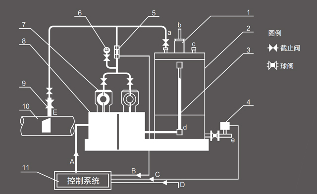 燃氣管道供氣時,流量計從管道中采集流量信號,通過二次表轉(zhuǎn)變,以4-20mA電信號或以通訊方式輸出,進入加臭控制器。控制器根據(jù)流量信號的大小輸出頻率信號控制加臭泵,指揮加臭泵的電磁鐵帶動柱塞做往復(fù)運動。推動泵的隔膜使泵頭容積發(fā)生變化,通過上、下單向閥吸入、排出臭劑。排出的臭劑經(jīng)過不銹鋼管道通過加入管加到燃氣管道中,完成加臭工作。臭劑貯存在計量罐中。