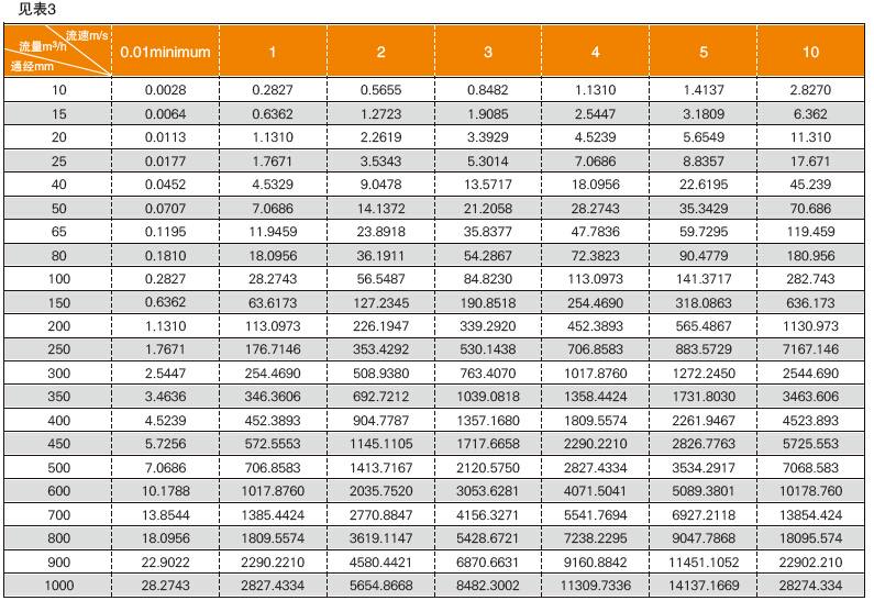 建議您可根據(jù)流速流量對照表(表3)再參考實(shí)際的工況條件選擇您的儀表口徑,最好流速在0.5~5m/s范圍.這樣有利于儀表的正常使用。
